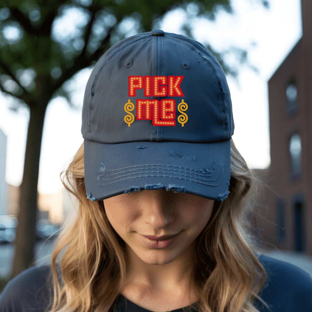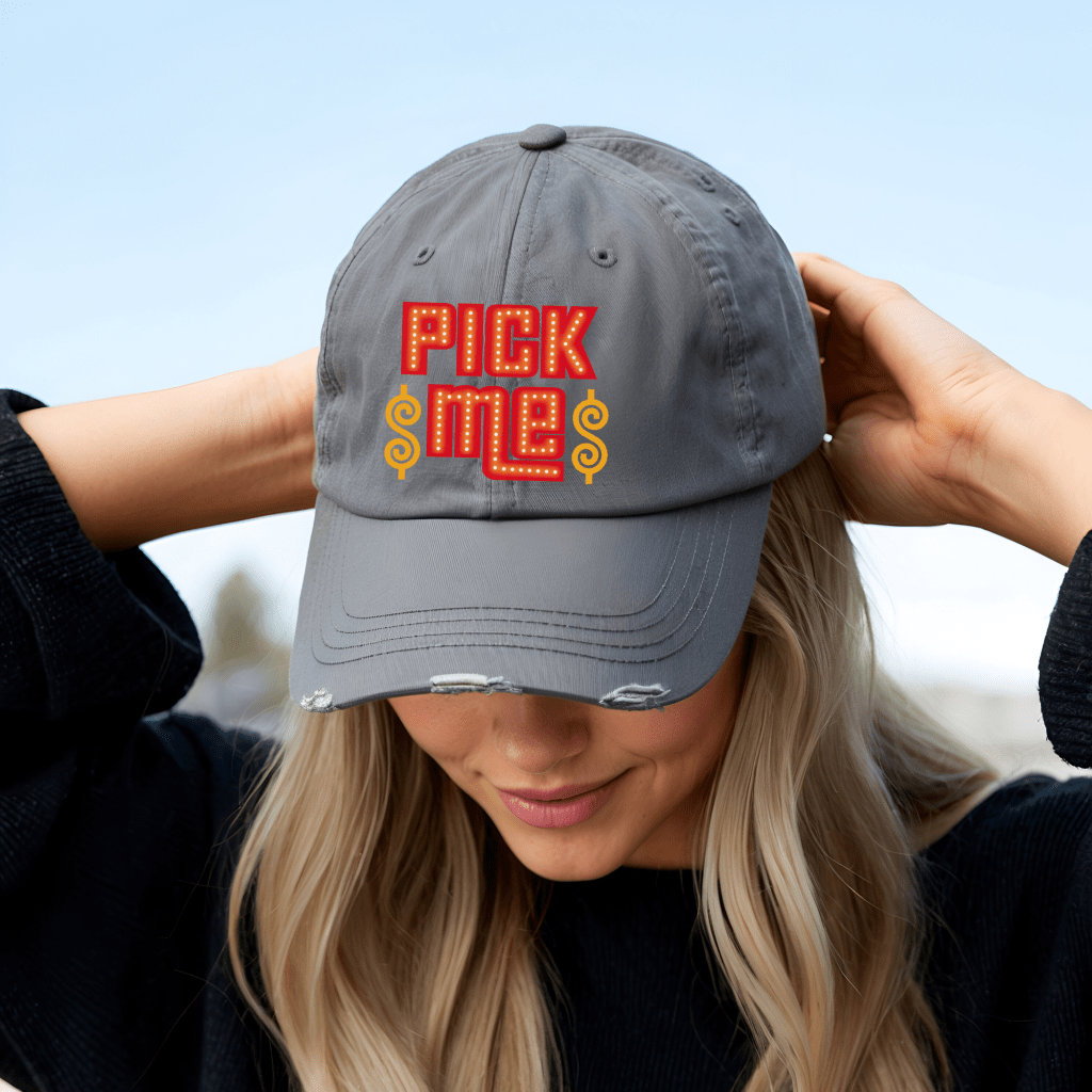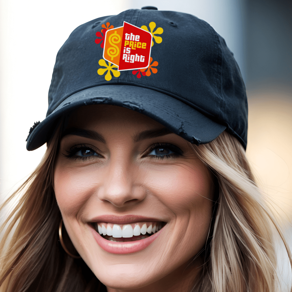 Get game-day ready with this Price is Right Distressed Hat, the perfect Pick Me Retro Game Show Baseball Cap to wear to the show! Featuring bold DTF-printed lettering, this Come on Down Attire adds a fun, vintage touch to your spinner wheel and prize winning experience. Complete your look with this must-have accessory and stand out in the crowd!