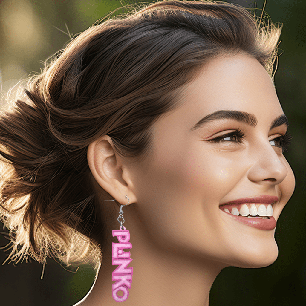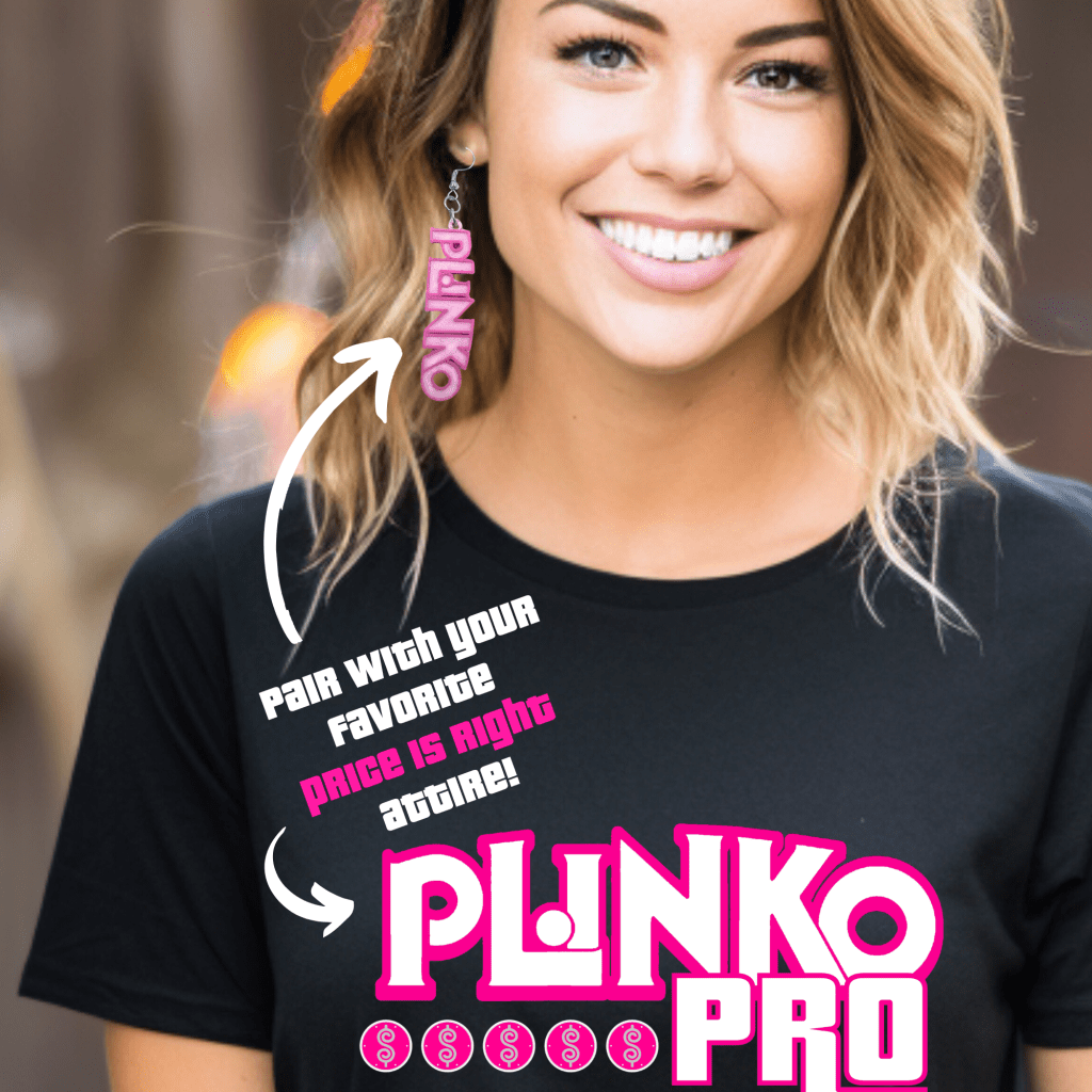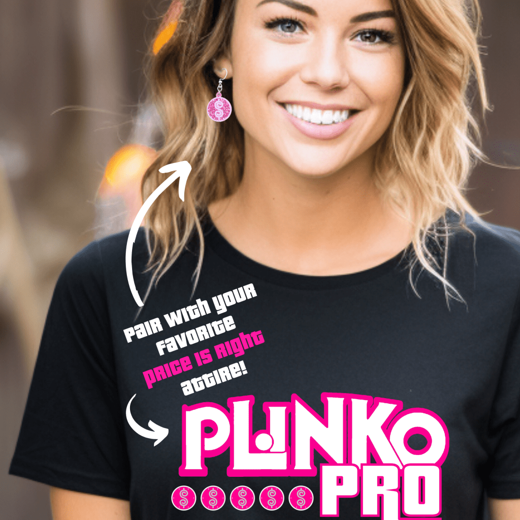 Add some sparkle to your game show style with these Price is Right Earrings for Plinko Fans! Featuring iconic Plinko chips crafted from pink glitter acrylic, these Game Show Dangle Earrings are perfect to pair with your favorite Price is Right shirt. Whether you’re shouting “Come On Down!” or cheering for Drew Carey, these earrings are a must-have for any Price is Right contestant or fan!