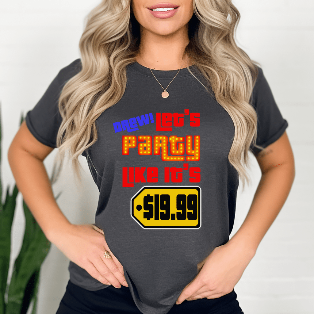 Gear up for the ultimate game show experience with our “Drew! Let’s party like it’s $19.99” Price is Right shirt! Featuring iconic phrases like ‘Come On Down’ and paying homage to legends like Bob Barker and Drew Carey, this Pick Me Game Show Shirt is a must-have for any Price is Right Live Contestant. Get ready to spin the wheel in style with this vibrant and nostalgic addition to your wardrobe.