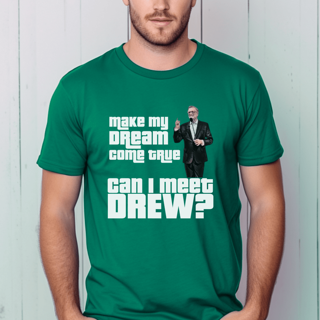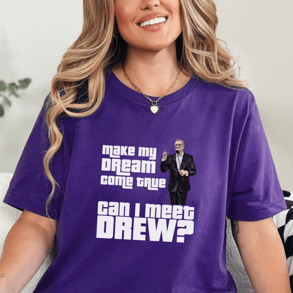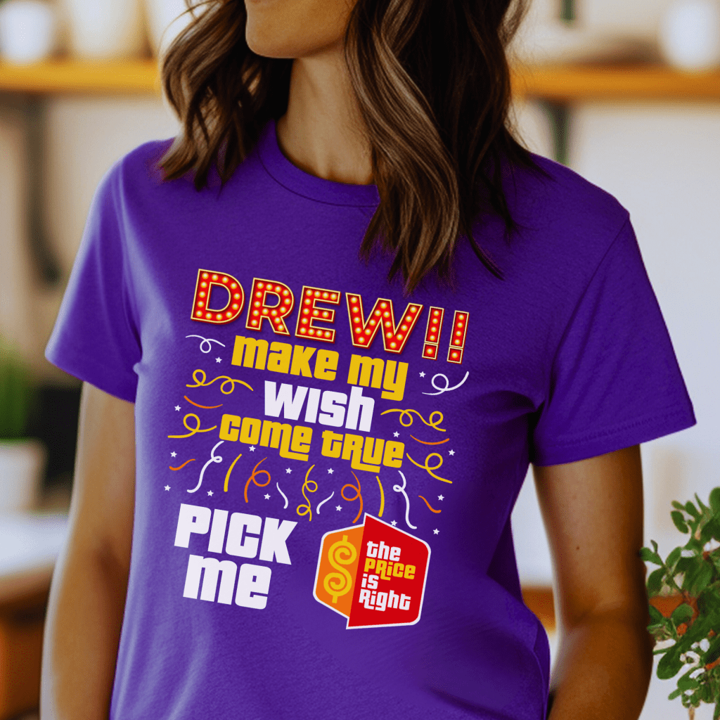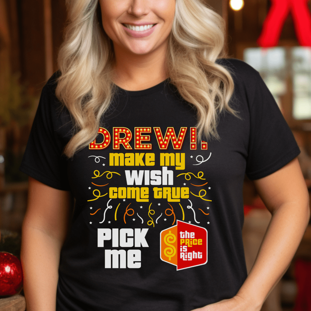 Get ready for your moment in the spotlight with our Price is Right Shirt that’s perfect for any Drew Carey fan! Featuring the playful phrase “Make my Dream Come True. Can I Meet Drew?”, this retro game show shirt is ideal for anyone hoping to be the next Price is Right live contestant. Whether you’re eyeing the spinner wheel or just want to shout Pick Me, this funny tee is sure to make you stand out.