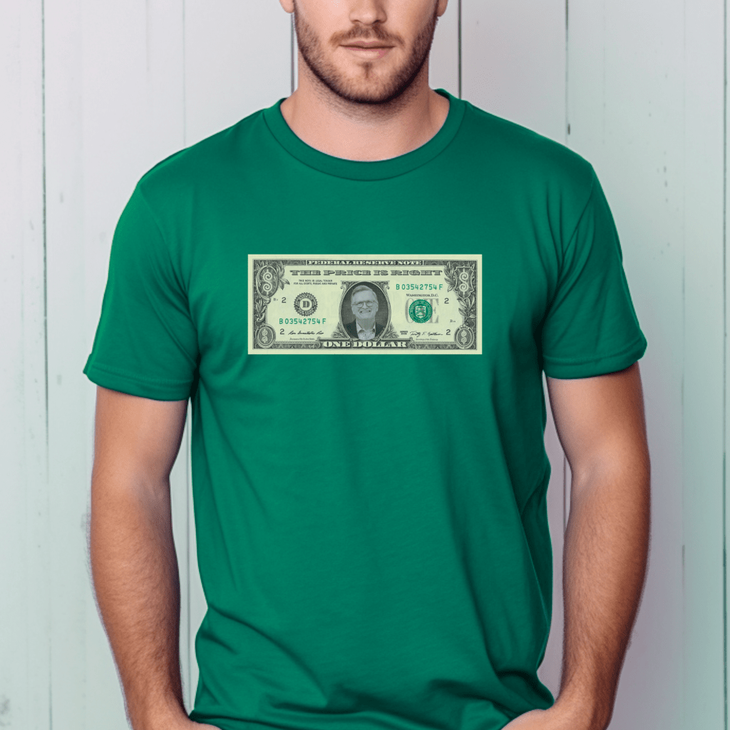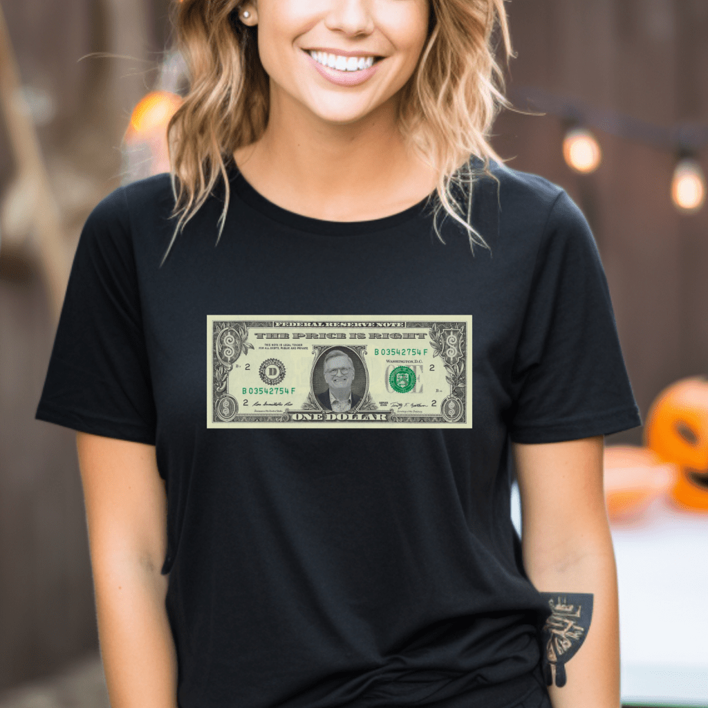 Get ready to “Come on Down” in style with this Price is Right Shirt must-have for any Drew Carey fan! Featuring a hilarious Dollar Bill with Drew Carey’s face and iconic Price is Right dollar signs, this retro game show t-shirt is perfect for any Price is Right contestant or fan. Ideal for showing off at the Spinner Wheel, this shirt is a fun nod to your favorite game show.