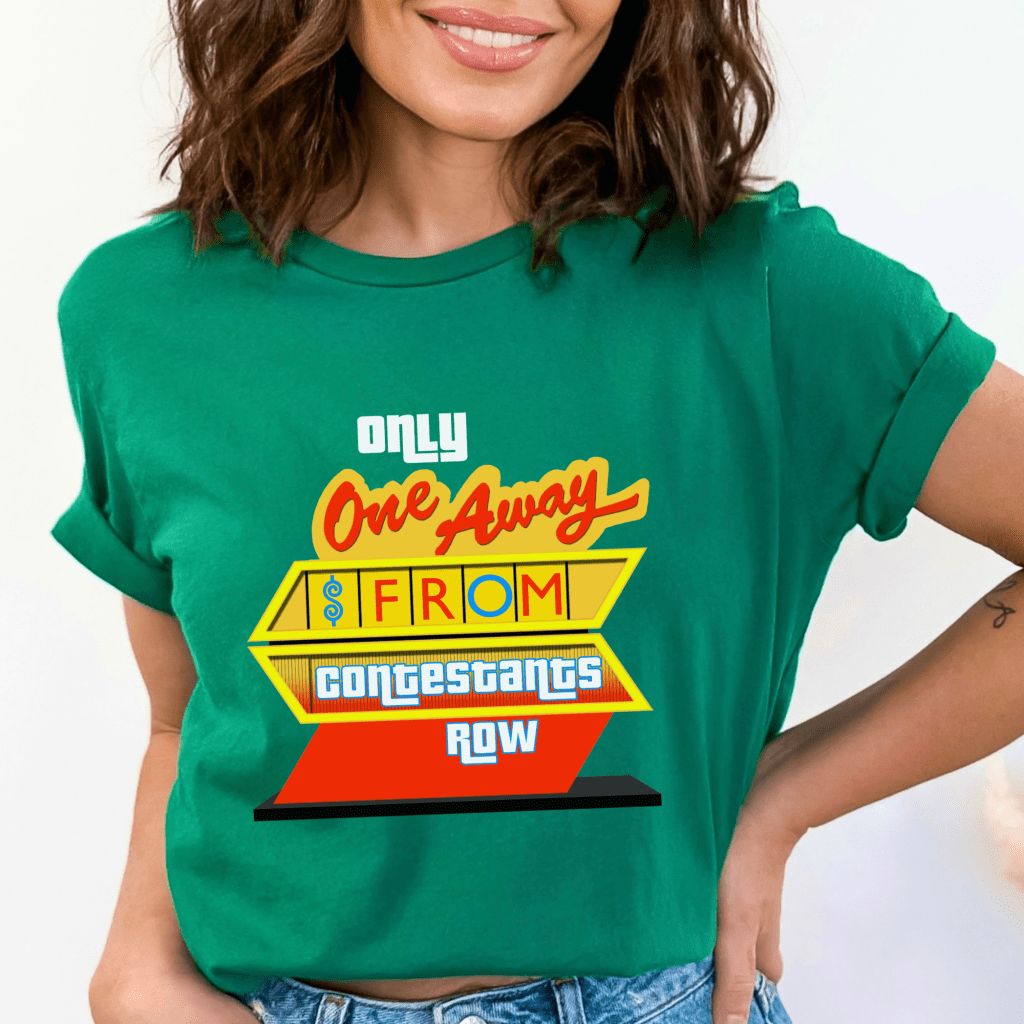 Stand out in the crowd with our ‘One Away from Contestants Row’ shirt, inspired by the thrilling One Away game on Price is Right! This retro TV game show design is sure to catch Drew Carey’s attention as you showcase your enthusiasm for the show. Whether you’re aiming for Contestants Row or just cheering from the audience, this shirt is a perfect fit for any Price is Right fan.