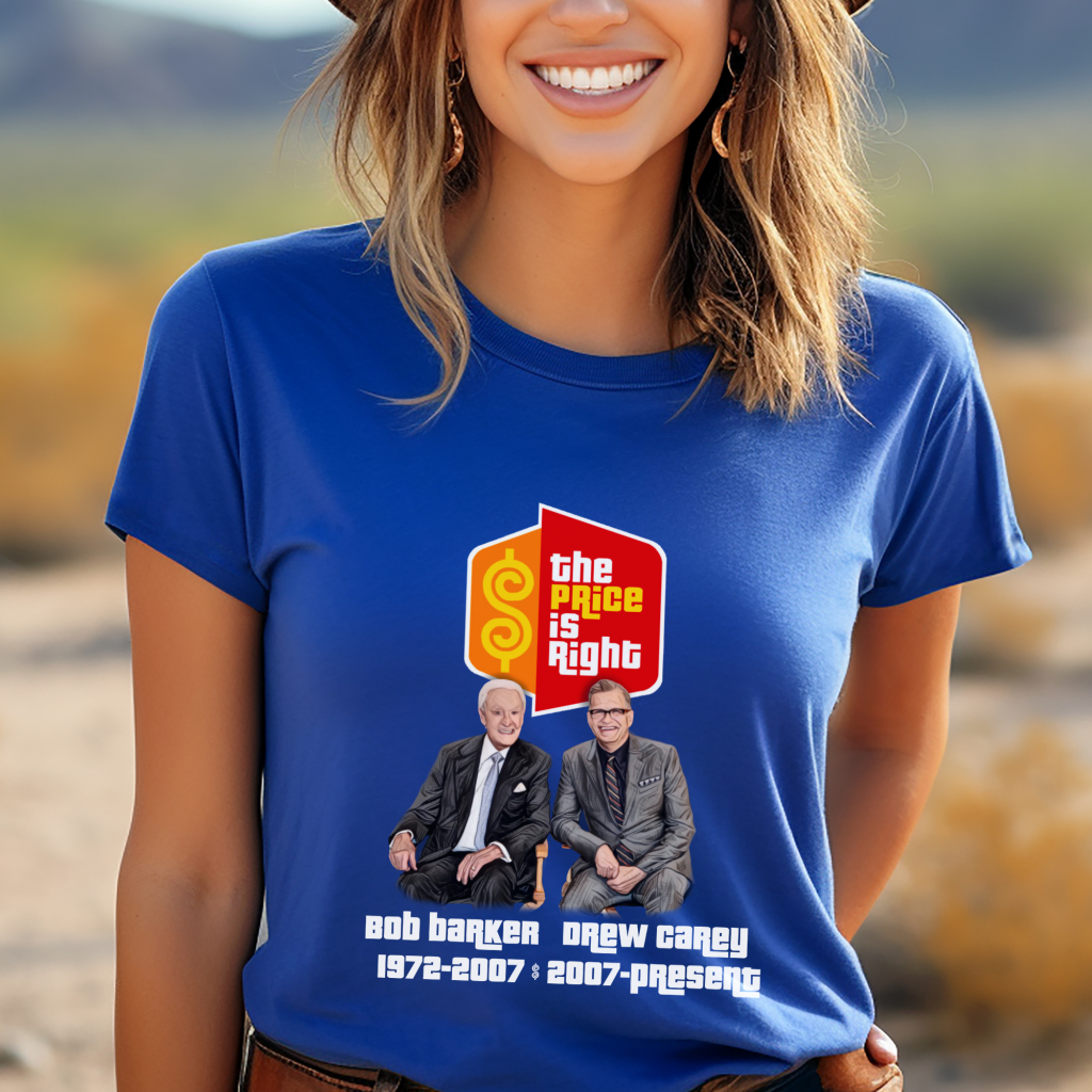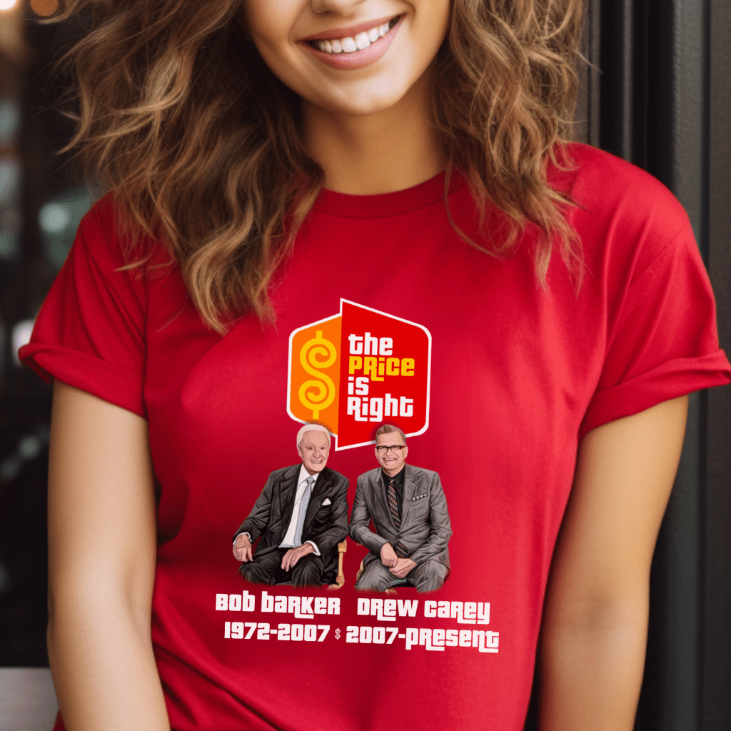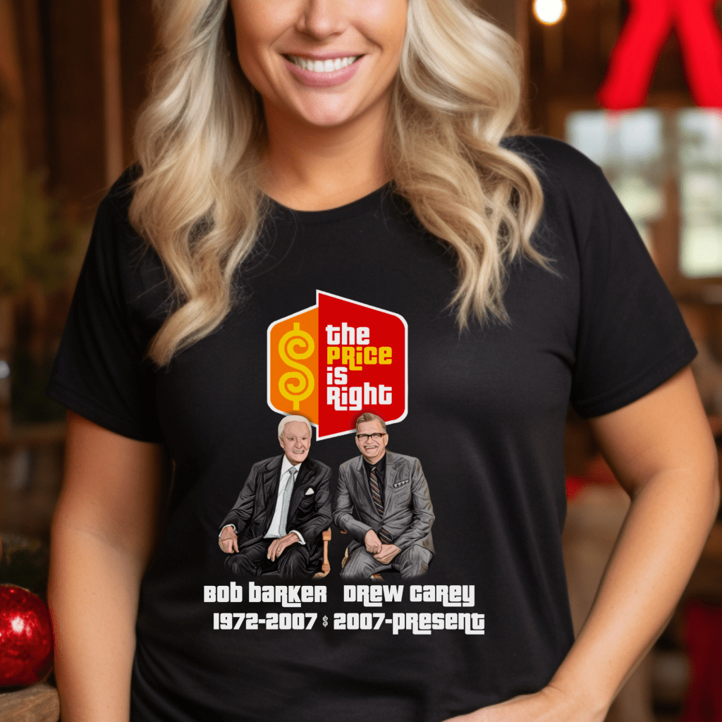 Get ready to “Come On Down” in style with this Price is Right Shirt featuring legendary hosts Bob Barker and Drew Carey, complete with their hosting years! Perfect for any super fan or live contestant, this retro game show t-shirt is the ultimate way to stand out and say, “Pick Me!” Whether you’re in the audience or watching from home, this tee is a must-have for fans of TV’s favorite game show.