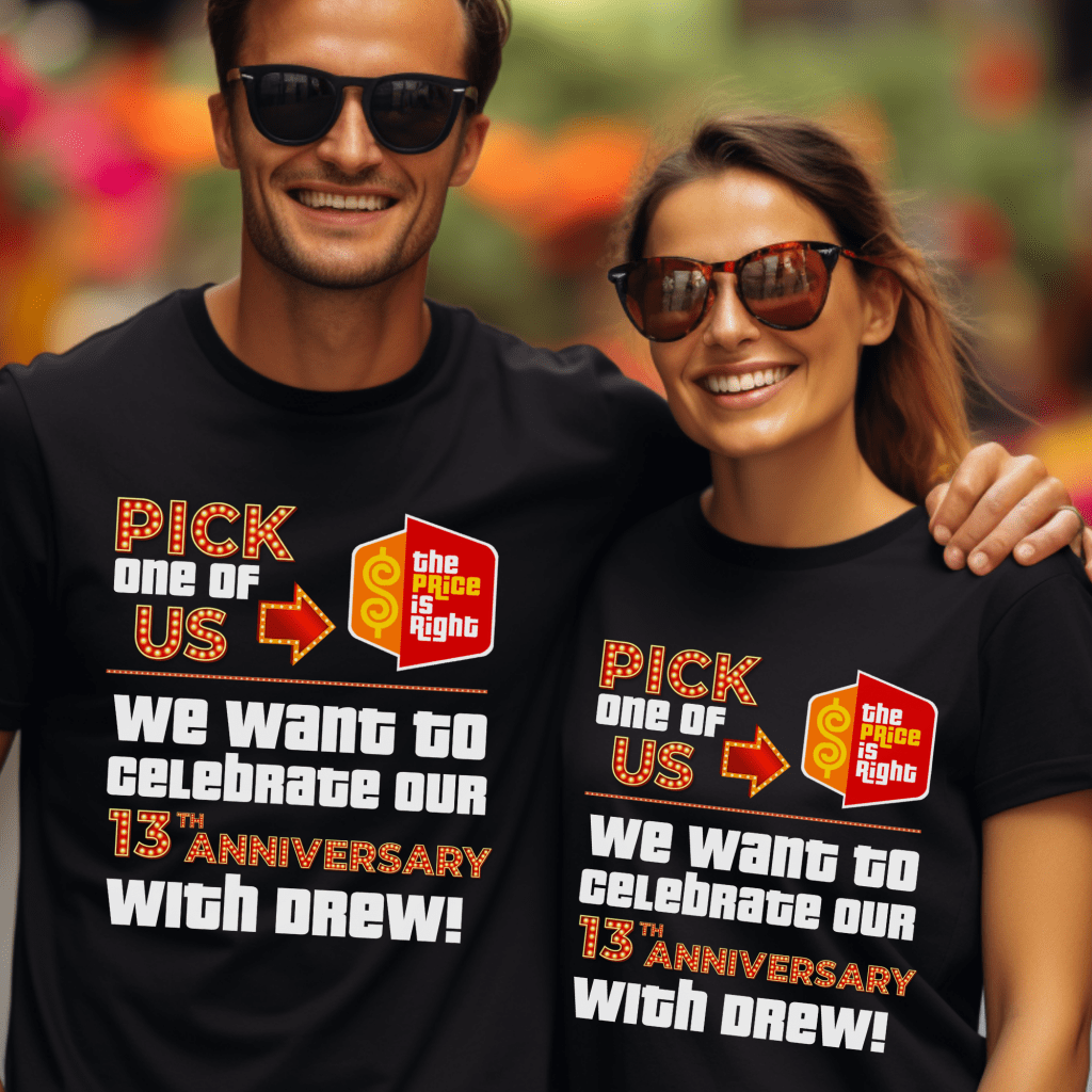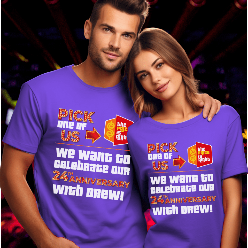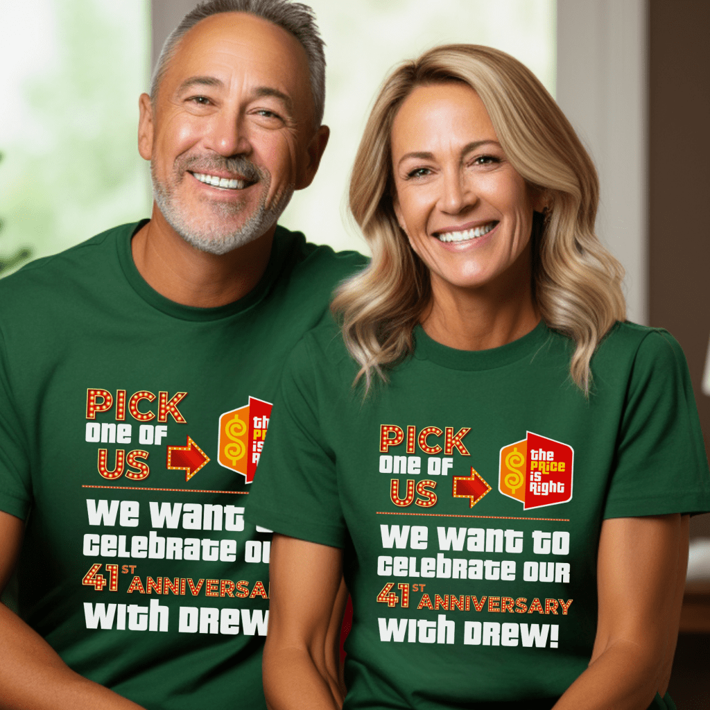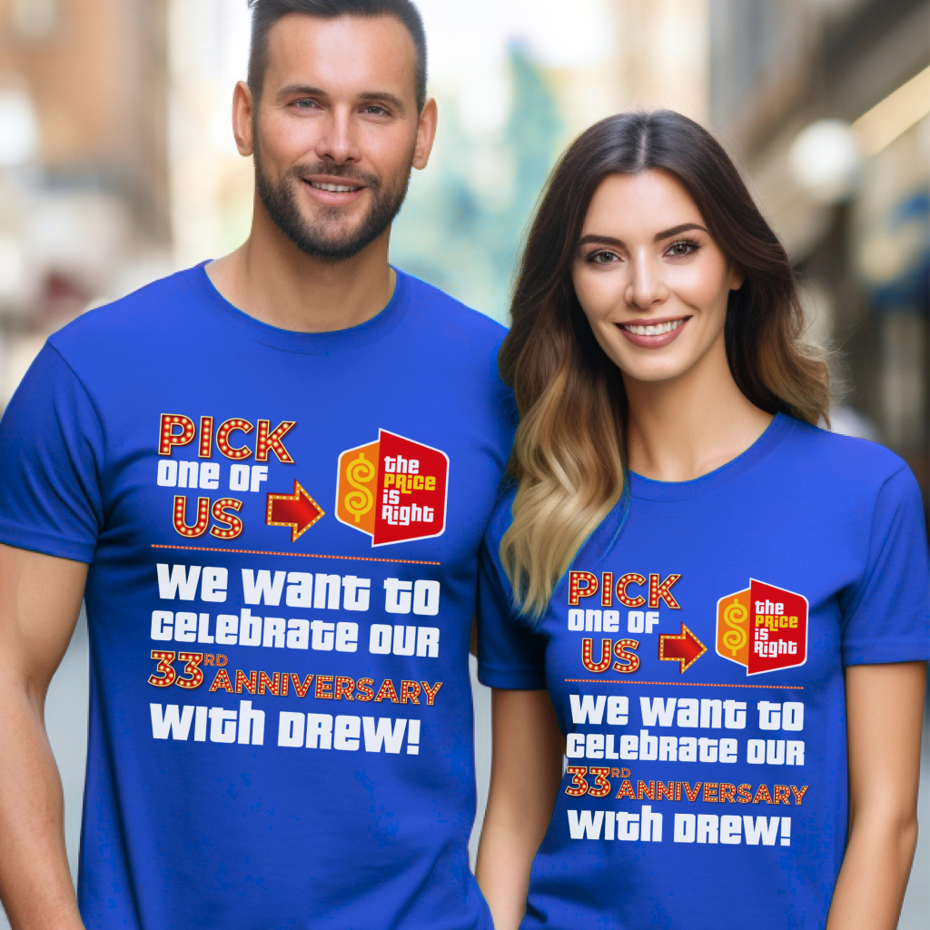 Celebrate your ##th anniversary in game show style with this Price is Right Shirt for Married Couple! Featuring a bold “Pick one of us. We want to celebrate our ##th Anniversary with Drew!” design, this customizable shirt is perfect for standing out in the audience. Whether you’re attending Price is Right Live or hoping to be a contestant, this fun retro game show tee will have you shouting “Come on down!” in style!