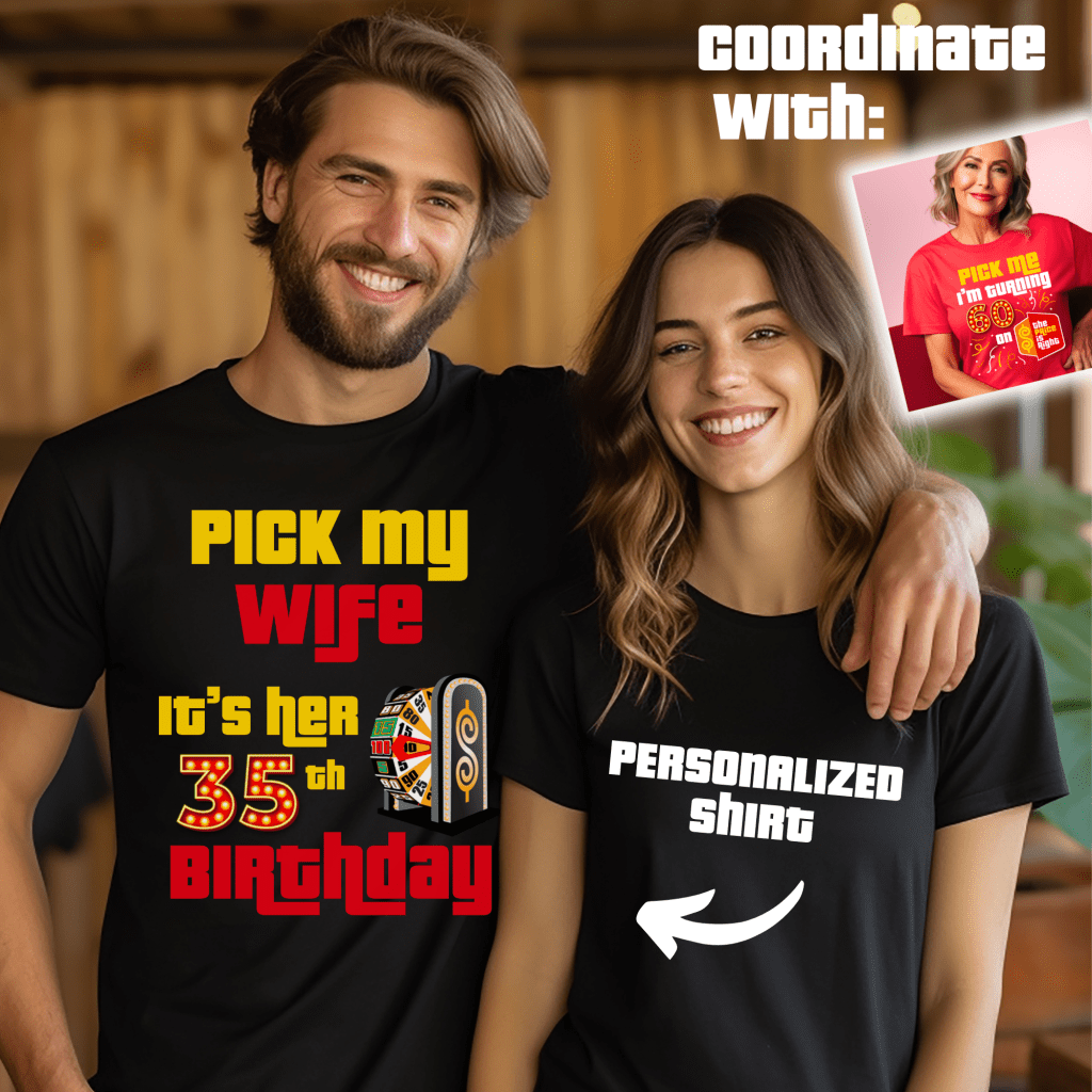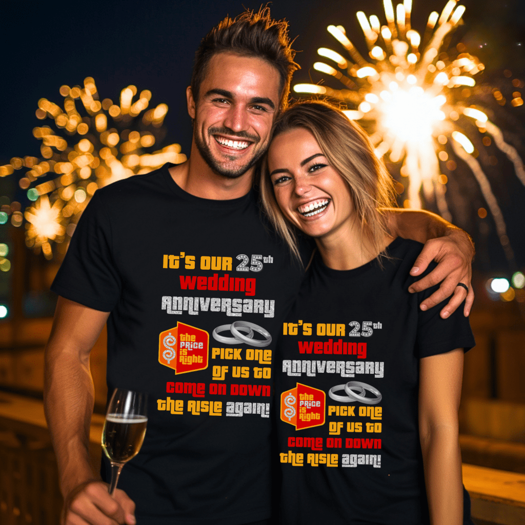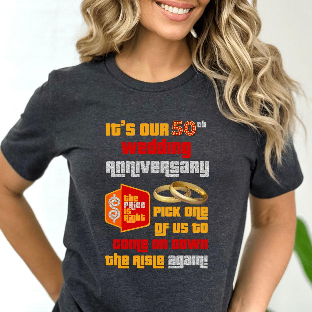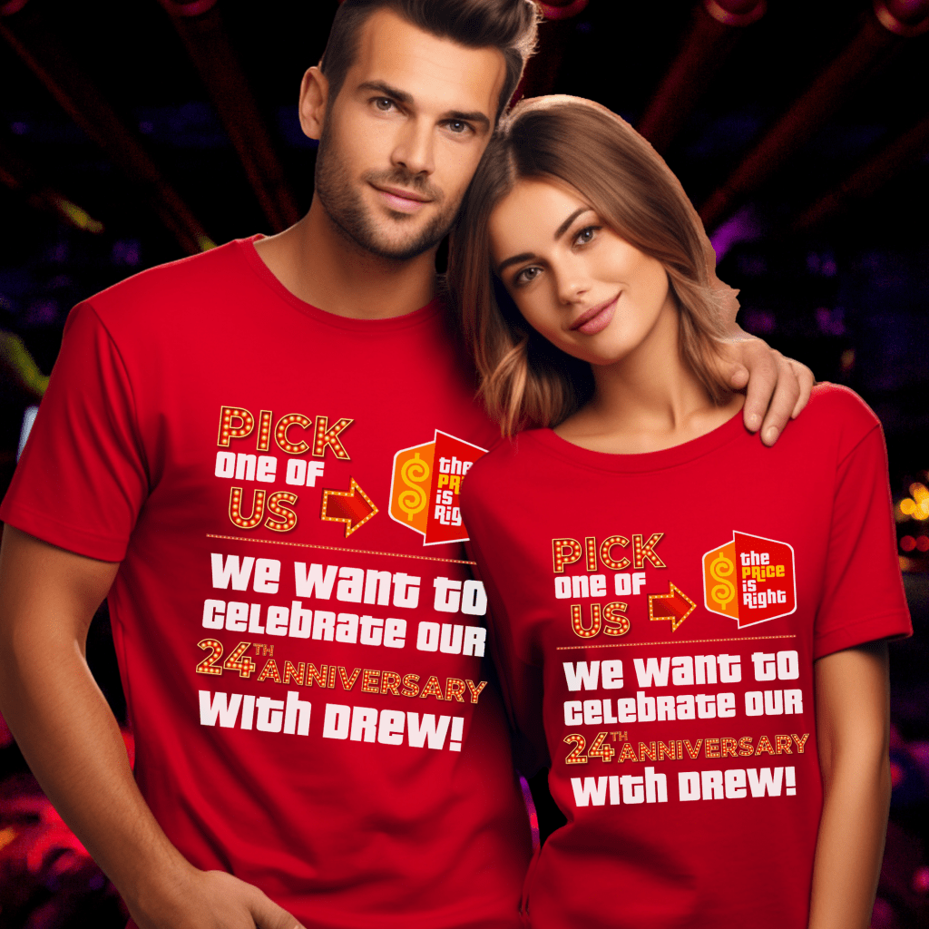 Celebrate your ##th anniversary in game show style with this Price is Right Shirt for Married Couple! Featuring a bold “Pick one of us. We want to celebrate our ##th Anniversary with Drew!” design, this customizable shirt is perfect for standing out in the audience. Whether you’re attending Price is Right Live or hoping to be a contestant, this fun retro game show tee will have you shouting “Come on down!” in style!