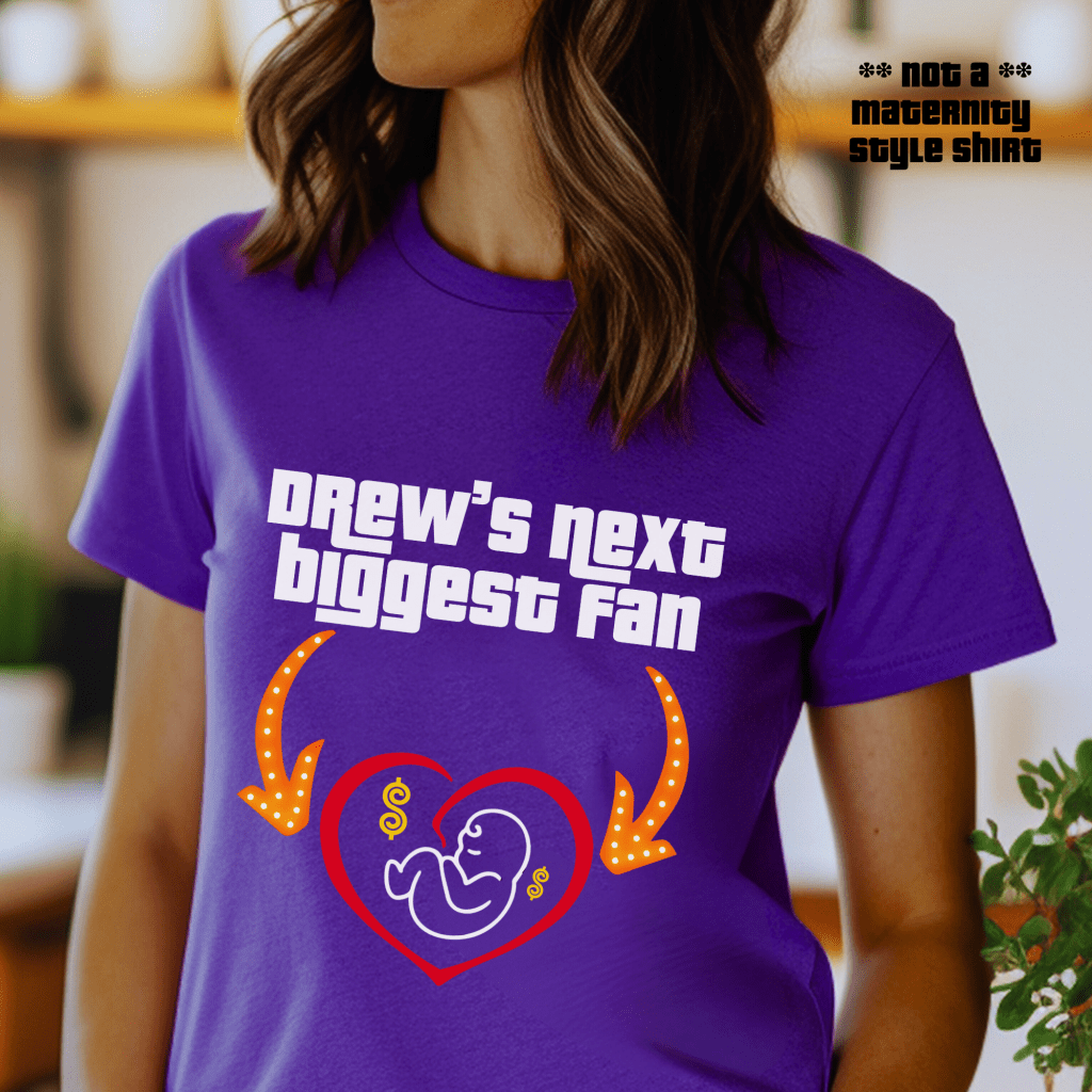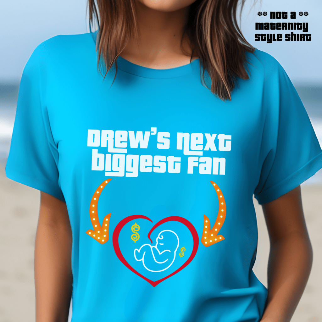 Get ready to turn heads at the show with this Price is Right Shirt for Maternity – perfect for any Expecting Mom Drew Carey Fan! Featuring “Drew’s Next Biggest Fan” with playful arrows pointing to your baby bump, this Pick Me Pregnancy Retro Game Show Tee is a must-have for any Price is Right Live Contestant. Designed in a regular unisex fit (not maternity style), it’s a fun and comfortable way to celebrate your growing little game show fan!