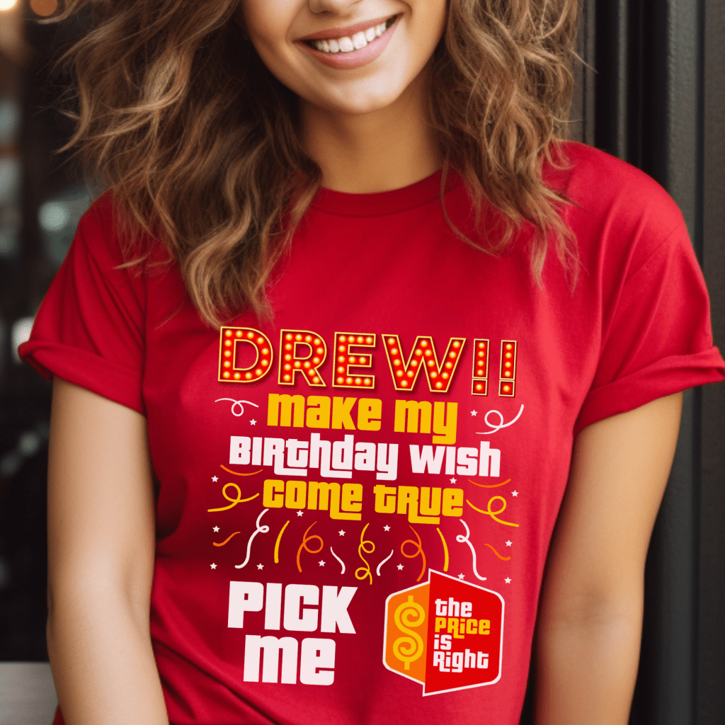 Get ready to “Come On Down” with our Price is Right Shirt for Birthday! This Pick Me Game Show Shirt is perfect for a milestone birthday celebration on the show, featuring the fun slogan, “Drew, Make My Birthday Wish Come True. Pick Me!” Ideal for fans hoping to become a Price is Right Live Contestant and catch Drew Carey’s attention on their special day!