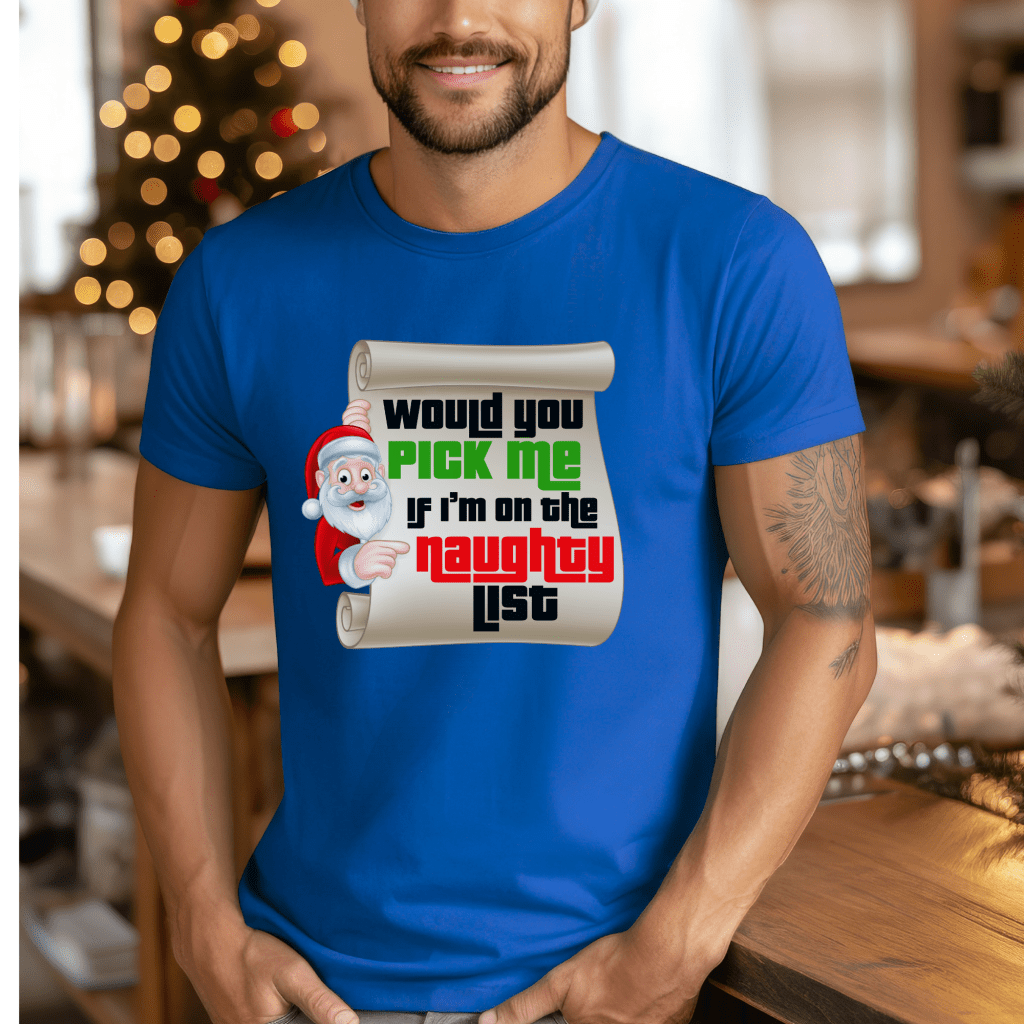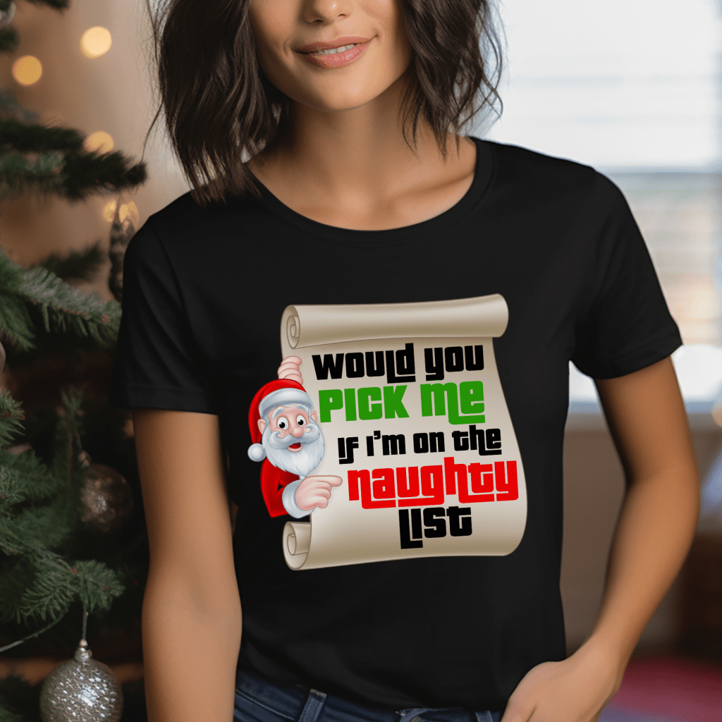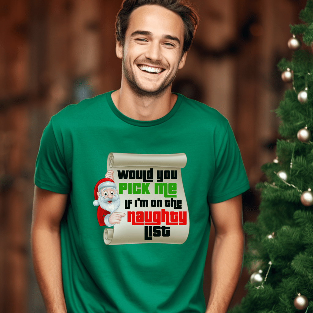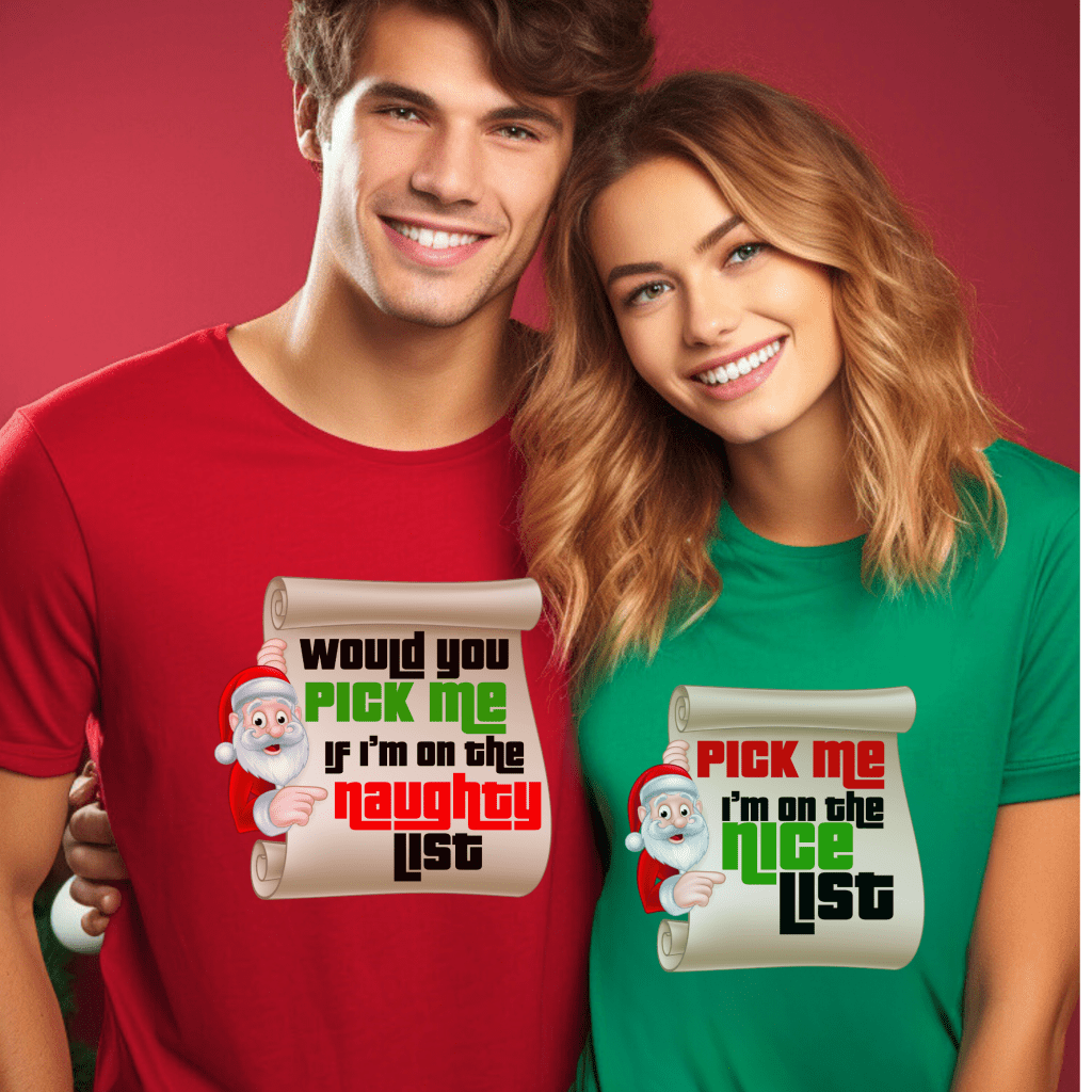 Get ready for the ultimate Price is Right experience with our matching pair of retro game show tees! (Sold Separately). Whether you’re aiming for the nice list with “Pick Me I’m on the Nice List” or feeling a bit mischievous with “Would you Pick Me if I’m on the Naughty List?”, these shirts are perfect for Christmas or any live TV show excitement. Channel your inner contestant, come on down, and stand out in the crowd with these Drew Carey-approved shirts. **Sold separately**