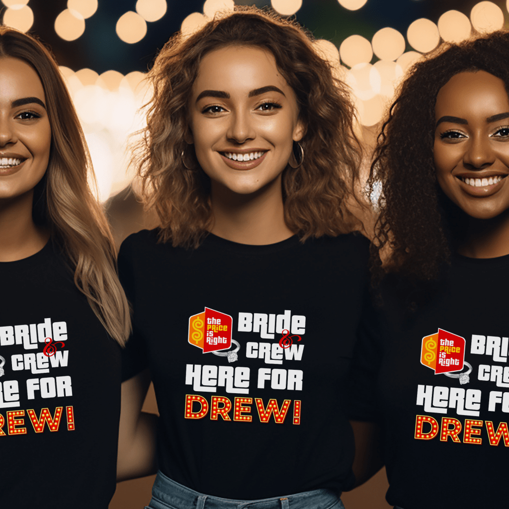 Get ready to “Come on Down” in style with this Bride & Crew Here for Drew Price is Right Group Shirt for Bachelorette Party fun! Perfect for the Bride to Be and her Bridal Party, this eye-catching Pick Me Shirt is a must-have for making unforgettable memories at the show. Whether you’re part of the Bride Squad or a fabulous Bridesmaid, this playful tee will have everyone spinning the Prize Wheel for attention!