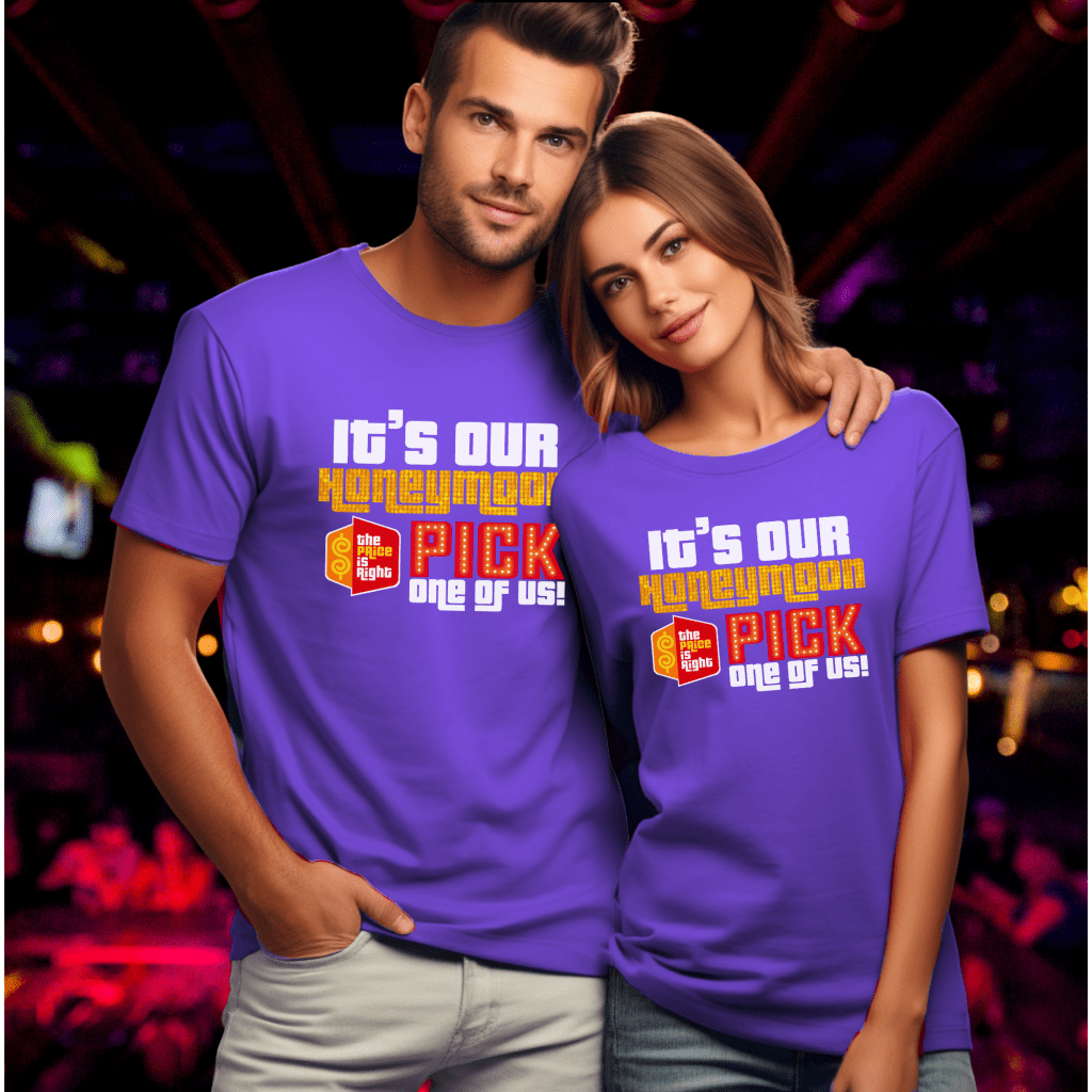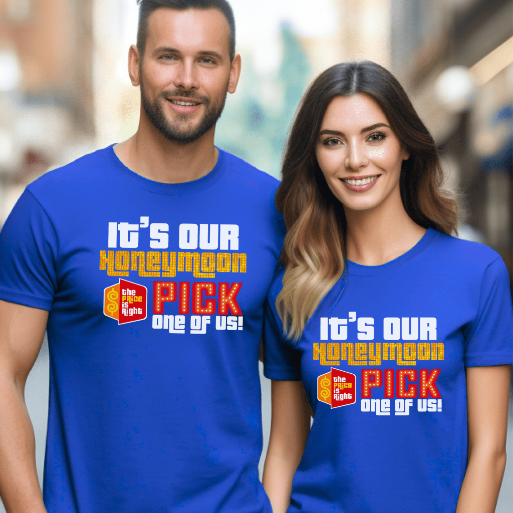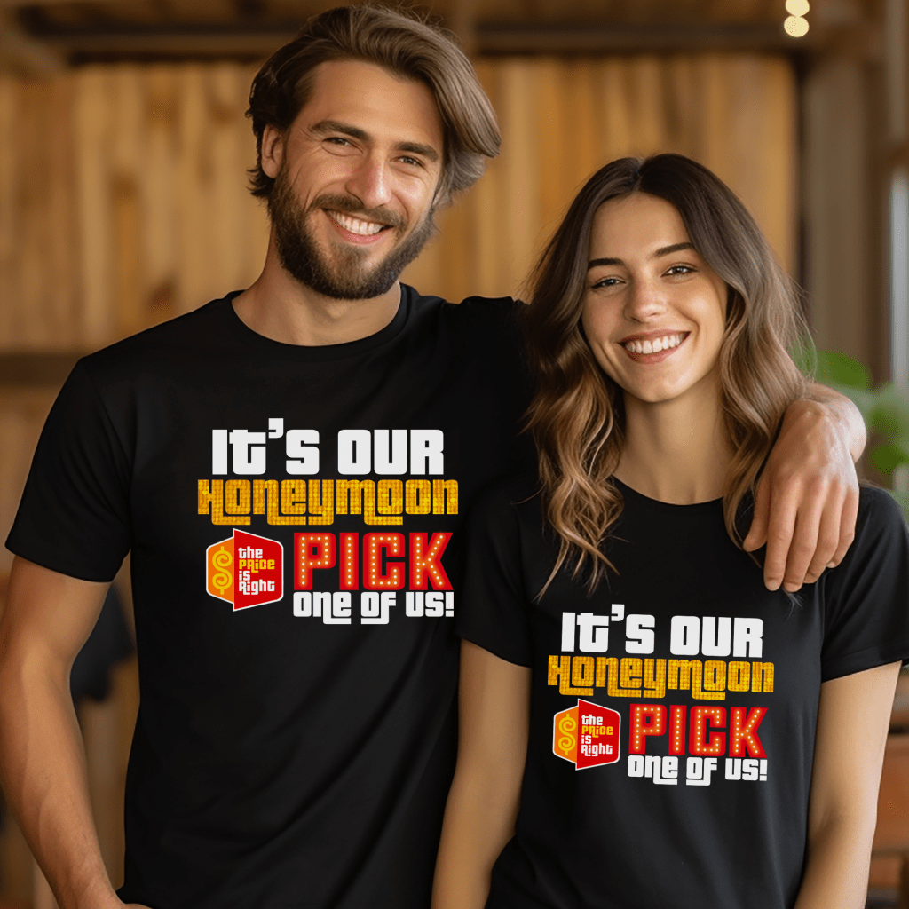 Get noticed at the show with this Price is Right Shirt for Honeymoon! Featuring the bold phrase “It’s our Honeymoon. Pick One of Us,” this Pick Me Game Show Shirt is perfect for newlyweds ready to shout “Come On Down!” Whether you’re hoping to meet Drew Carey or become a Price is Right Live Contestant, this fun shirt will make sure all eyes are on you! Just Married and ready to win!