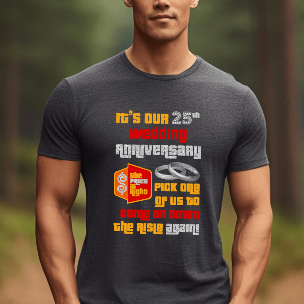 Get ready for your big moment on The Price is Right with this fun “It’s Our Anniversary. Pick One of Us” shirt! Perfect for couples celebrating their special day, this Price is Right Shirt for Anniversary is a must-have for any Price is Right Live Contestant. Show Drew Carey you’re ready to Come On Down and play with this hilarious Pick Me Game Show Shirt!