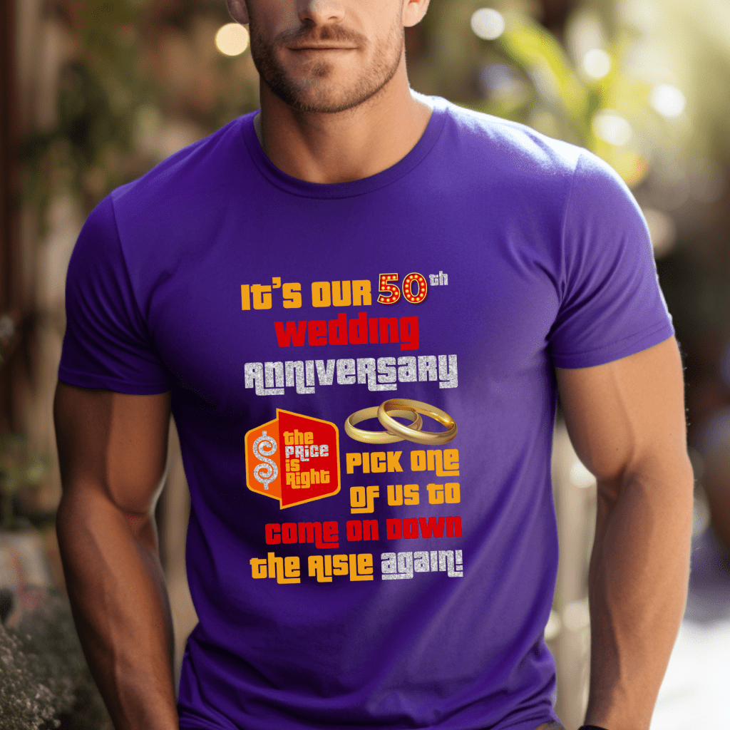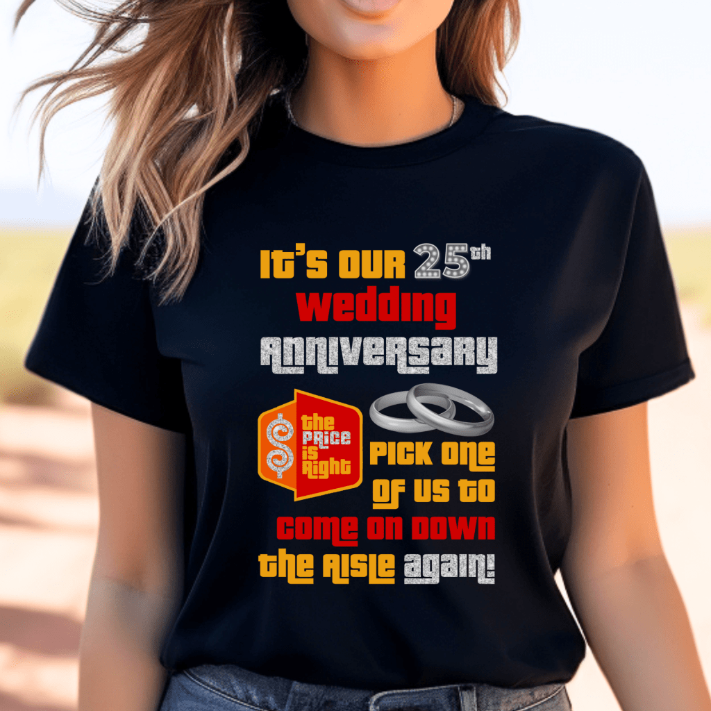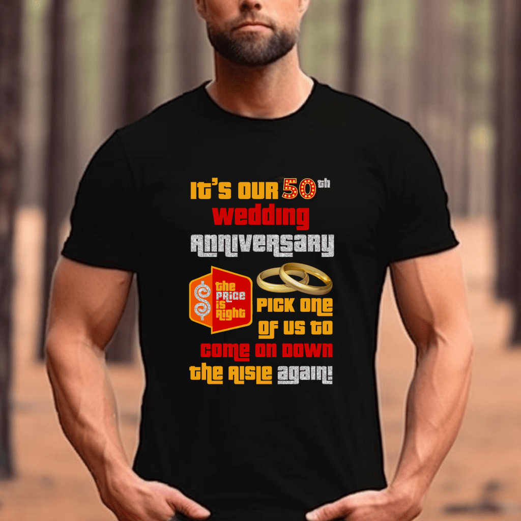 Get ready for your Price is Right adventure with this hilarious “It’s our # Wedding Anniversary” shirt, perfect for married couples! This retro TV game show shirt is a must-have for any Price is Right contestant, featuring the iconic phrase “Come On Down” and a witty twist. Join Drew Carey and relive the excitement of the aisle with this funny and memorable shirt with Silver or Gold ring options.